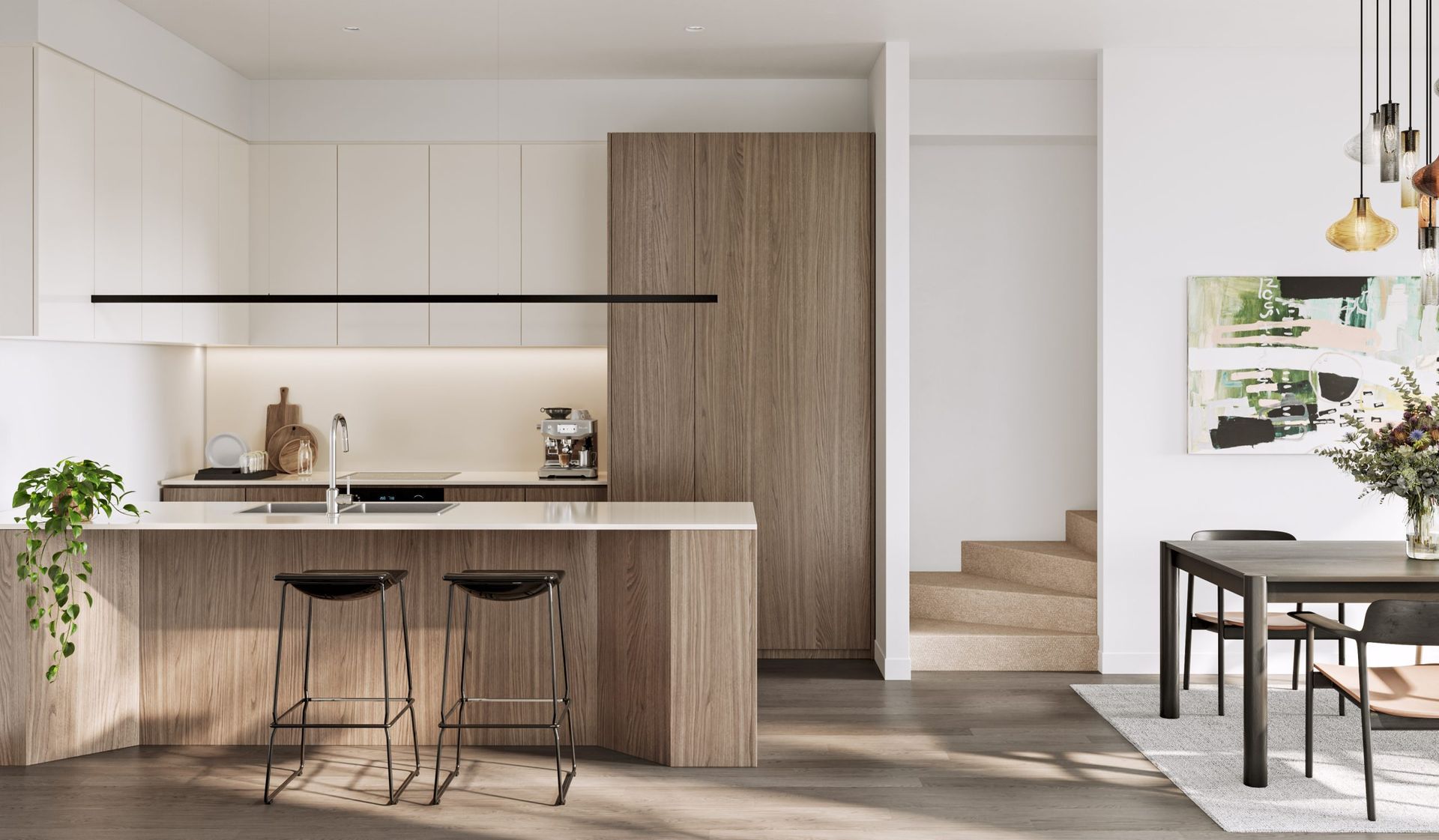 - Thiết kế phòng bếp ở Kingloch Parade đúng chuẩn dành cho những nữ chủ nhân gia đình hiện đại với đủ các loại bếp chính đa tính năng thường được lắp đặt trong các ngôi nhà phố ở Úc. Nhà phố Kingloch Parade với kiến trúc hai tầng được bố trí mỗi tầng một phòng bếp tiện lợi.